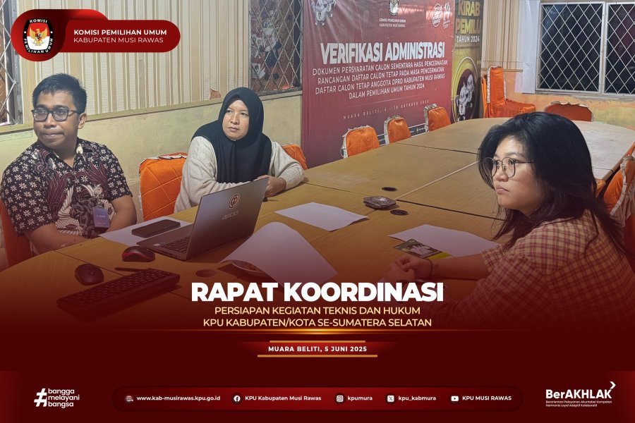#TemanPemilih, KPU Kabupaten Musi Rawas mengikuti Rapat Koordinasi Persiapan Kegiatan Teknis dan Hukum KPU Kabupaten/Kota Se-Sumatera Selatan secara daring di Kantor KPU Kabupaten Musi Rawas (5/6/2025) ...