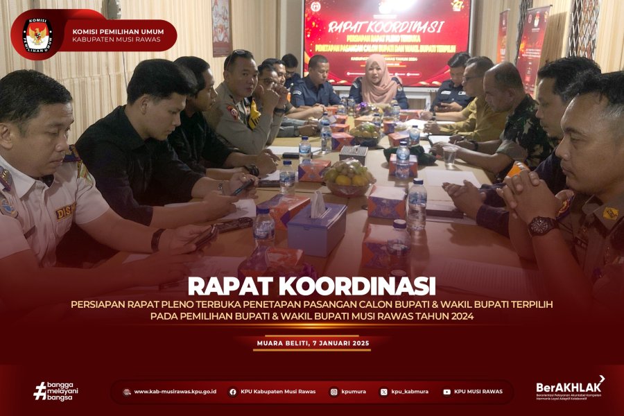 #TemanPemilih, KPU Kabupaten Musi Rawas melaksanakan kegiatan Rapat Koordinasi Persiapan Rapat Pleno Terbuka Penetapan Pasangan Calon Bupati & Wakil Bupati Terpilih Pada Pemilihan Bupati & Wakil Bupati Musi Rawas Tahun 2024 di Kantor KPU Kabupaten Musi Rawas (7/1/2025) ..