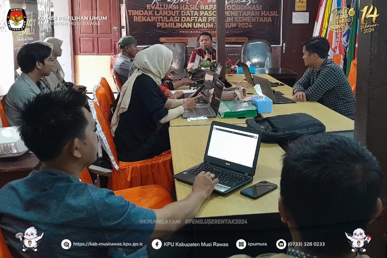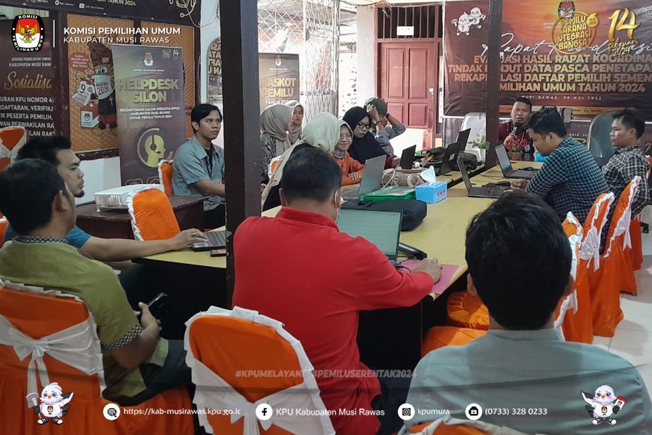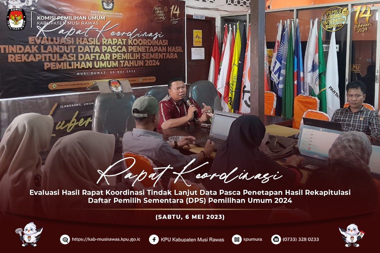 #TemanPemilih, KPU Kabupaten Musi Rawas bersama Panitia Pemilihan Kecamatan (PPK) Se-Kabupaten Musi Rawas melaksanakan Rapat Koordinasi Evaluasi Hasil Rapat Koordinasi Tindak Lanjut Data Pasca Penetapan Hasil Rekapitulasi Daftar Pemilih Sementara (DPS) Pemilihan Umum 2024 (6/5/2023) ..