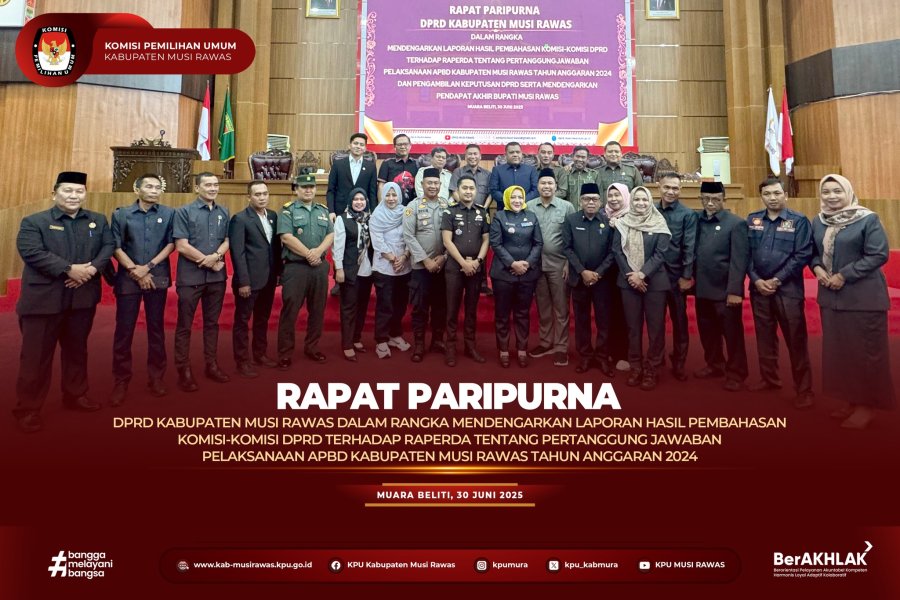 #TemanPemilih, Ketua KPU Kabupaten Musi Rawas, Ibu Ania Trisna AD, SH., MH menghadiri Rapat Paripurna DPRD Kabupaten Musi Rawas dalam rangka mendengarkan laporan hasil pembahasan komisi-komisi DPRD terhadap RAPERDA tentang pertanggungjawaban pelaksanaan APBD Kabupaten Musi Rawas tahun anggaran 2024 dan pengambilan keputusan DPRD serta mendengarkan pendapat akhir Bupati Musi Rawas (30/62025) ..