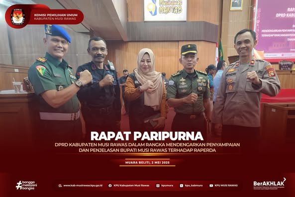 #TemanPemilih, Ketua KPU Kabupaten Musi Rawas, Ibu Ania Trisna AD didampingi Kasubbag Hukum dan Teknis, Ibu Erlina menghadiri Rapat Paripurna DPRD Kabupaten Musi Rawas dalam rangka mendengarkan penyampaian dan penjelasan Bupati Musi Rawas terhadap Raperda Kabupaten Musi Rawas Tahun 2025 (2/5/2025) ..