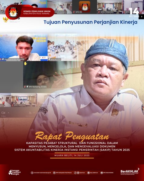 #TemanPemilih, Sekretaris KPU Kabupaten Musi Rawas, Bapak H. Nailul Azmi, S.Psi., MM beserta Kasubbag Perencanaan, Data, dan Informasi KPU Kabupaten Musi Rawas, Ibu Yanti Maretha Kristina, S.Kom mengikuti kegiatan Rapat Penguatan Kapasitas Pejabat Struktural dan Fungsional dalam Menyusun, Mengelola, dan Mengevaluasi Dokumen Sistem Akuntabilitas Kinerja Instansi Pemerintah (SAKIP) Tahun 2025 secara daring di Kantor KPU Kabupaten Musi Rawas (14/7/2025) ..