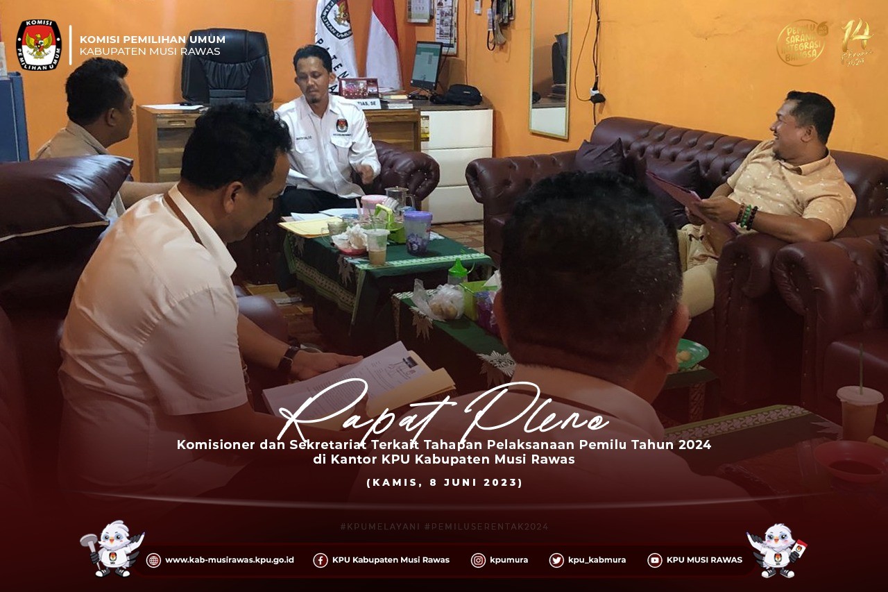 #TemanPemilih, Komisioner dan Sekretariat KPU Kabupaten Musi Rawas melaksanakan Rapat Pleno Terkait Tahapan Pelaksanaan Pemilu Tahun 2024 di Kantor KPU Kabupaten Musi Rawas (8/6/2023) .. .