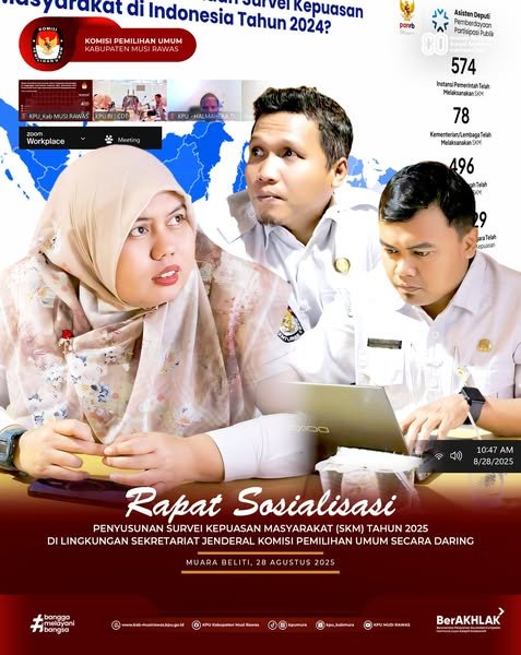 #TemanPemilih, Sekretariat KPU Kabupaten Musi Rawas mengikuti Rapat Sosialisasi Penyusunan Survei Kepuasan Masyarakat (SKM) Tahun 2025 di Lingkungan Sekretariat Jenderal KPU secara daring di Kantor KPU Kabupaten Musi Rawas (28/8/2025) ..