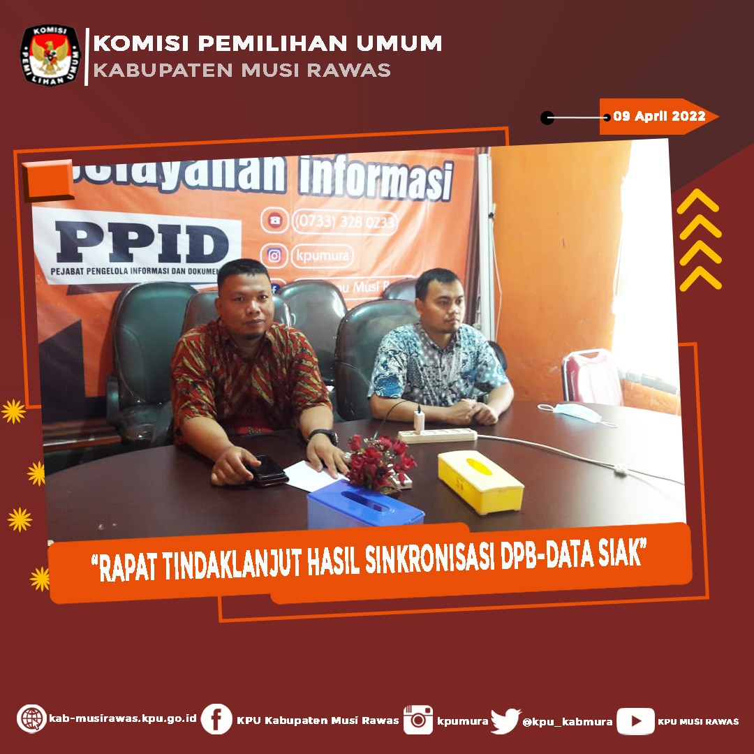 Sabtu (09/04), KPU Kabupaten Musi Rawas mengikuti kegiatan "Rapat Tindaklanjut Hasil Sinkronisasi DPB - Data SIAK" secara daring yang diikuti oleh Anggota KPU Kabupaten Musi Rawas Divisi Program dan Data, Bapak Wahyu Hidayat Setiyadi, S.E. dan Operator Sidalih KPU Kabupaten Musi Rawas, Rikki Febriansyah, S.E..