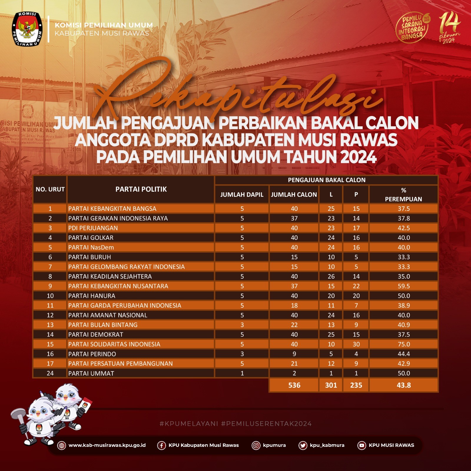 #TemanPemilih, berikut kami infomasikan mengenai Rekapitulasi Jumlah Pengajuan Perbaikan Dokumen Bakal Calon Anggota DPRD Kabupaten Musi Rawas Pada Pemilihan Umum Tahun 2024 .. .