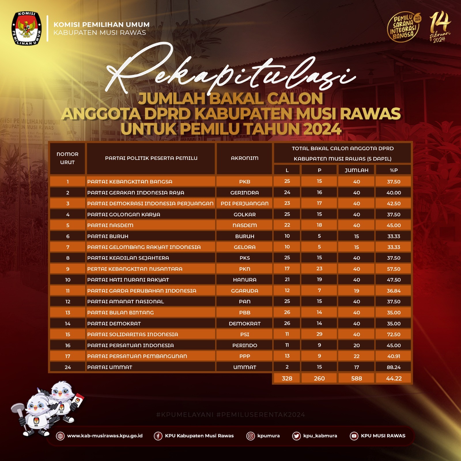 #TemanPemilih,berikut kami sampaikan Rekapitulasi Jumlah Bakal Calon Anggota Dewan Perewakilan Rakyat Daerah (DPRD) Kabupaten Musi Rawas Untuk Pemilihan Umum Tajun 2024 .. .