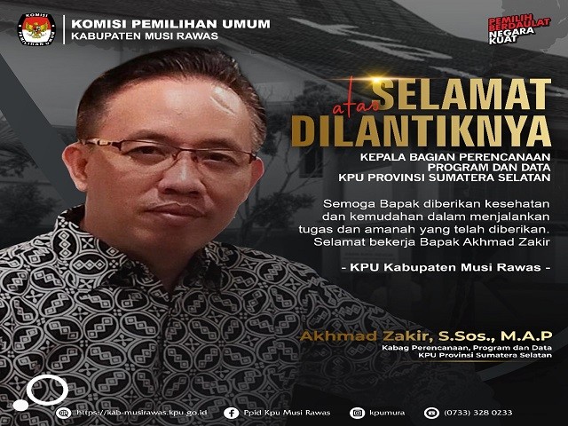 Selamat atas dilantiknya Bapak Akhmad Zakir, S.Sos.,M.A.P. sebagai Kepala Bagian Perencanaan Program dan Data KPU Provinsi Sumatera Selatan