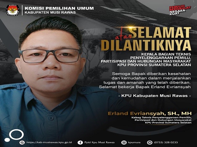 Selamat atas dilantiknya Bapak Erland Evriansyah sebagai Kepala Bagian Teknis Penyelenggaraan Pemilihan, Partisipasi dan Hubungan Masyarakat KPU Provinsi Sumatera Selatan