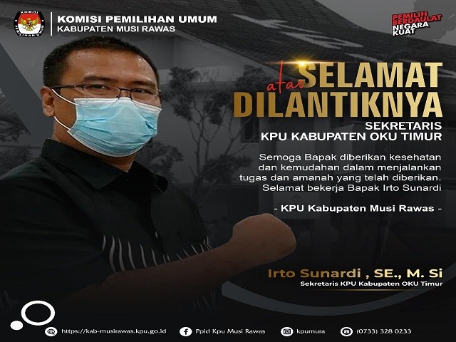 Selamat atas dilantiknya Bapak Irto Sunarsi, S.E.,M.Si. sebagai Sekretaris KPU Kabupaten Oku Timur. Semoga bapak diberikan kesehatan dan kemudahan dalam menjalankan amanah.