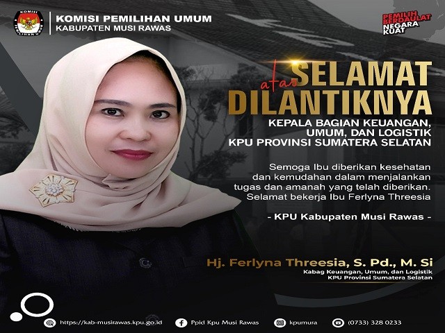 Selamat atas dilantiknya Ibu Ferlyna Threesia, S.Pd.,M.Si.sebagai Kepala Bagian Keuangan, Umum dan Logistik KPU Provinsi Sumatera Selatan