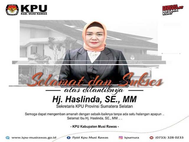 Komisi Pemilihan Umum Kabupaten Musi Rawas Mengucapkan Selamat dan Sukses Atas Dilantiknya Hj. Haslinda, S.E., M.M. sebagai Sekretaris Komisi Pemilihan Umum Provinsi Sumatera Selatan.