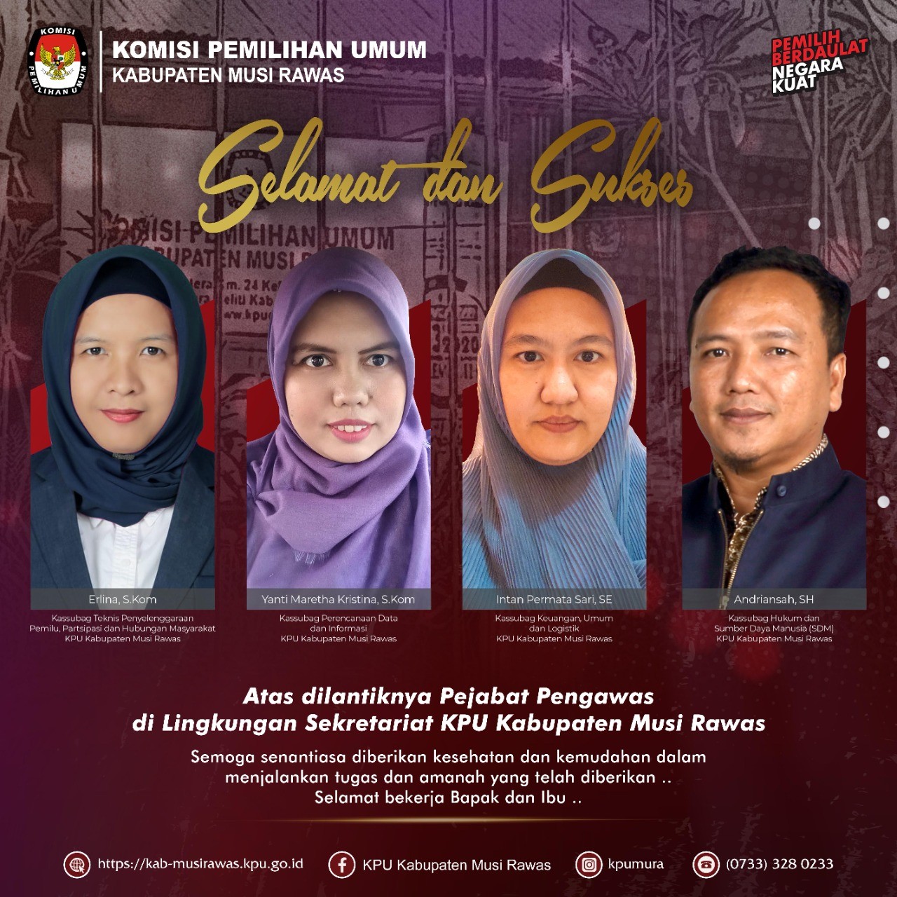 Segenap keluarga besar KPU Kabupaten Musi Rawas mengucapkan selamat bertugas kepada Bapak dan Ibu Kasubbag yang baru dilantik di lingkungan KPU Kabupaten Musi Rawas. Semoga selalu diberikan kesehatan dan kemudahan dalam menjalankan amanah yang diberikan.