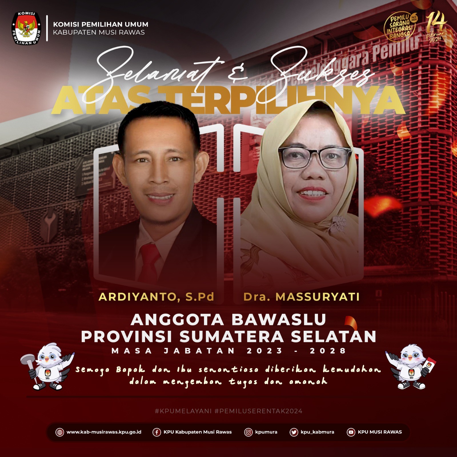 #TemanPemilih, segenap jajaran KPU Kabupaten Musi Rawas mengucapkan Selamat dan Sukses atas terpilihnya Bapak Ardiyanto, S.Pd dan Ibu Dra. Massuryati sebagai Anggota Bawaslu Sumsel Masa Jabatan 2023-2028 ..
