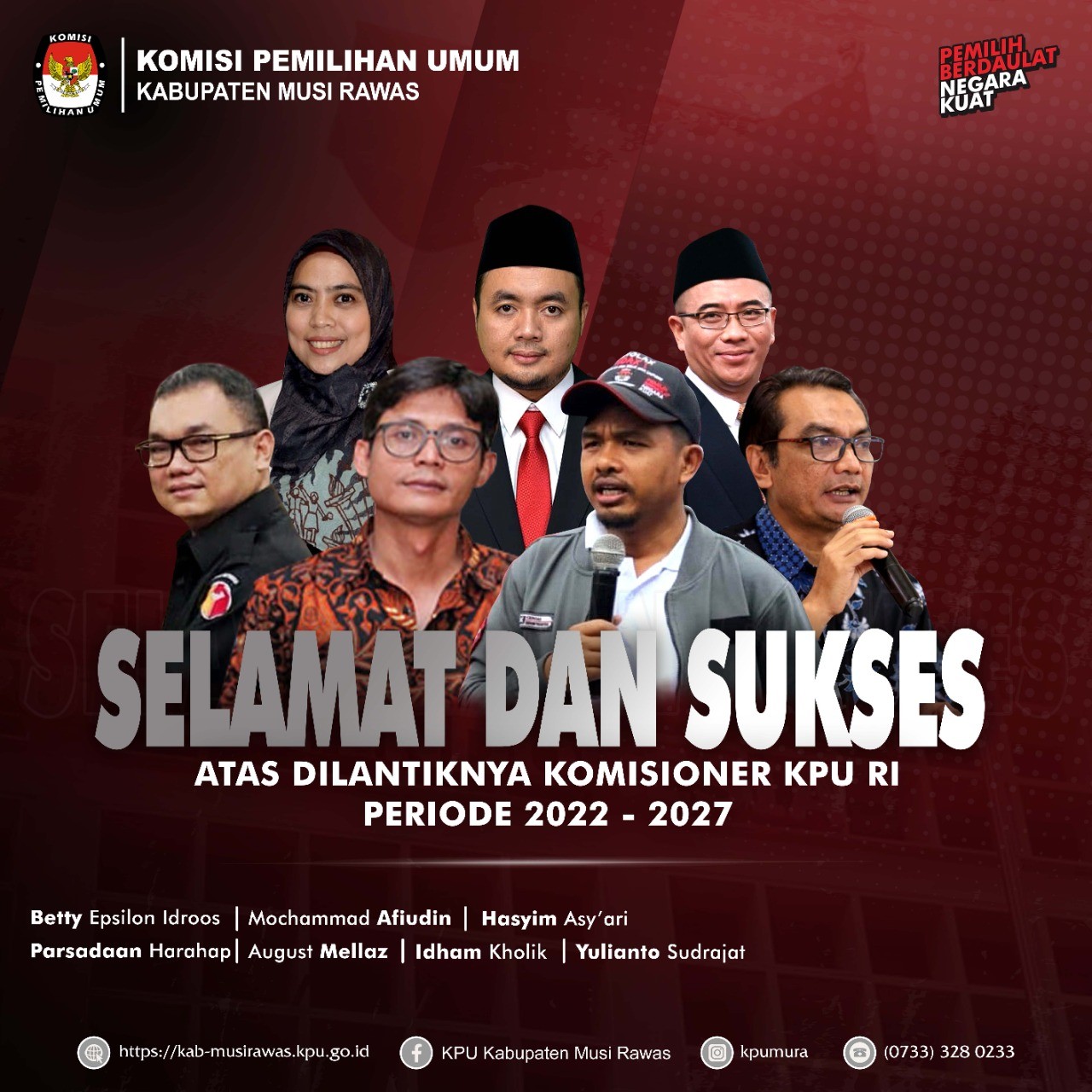 KPU Kabupaten Musi Rawas mengucapkan selamat dan sukses atas dilantiknya Anggota KPU RI periode 2022-2027. Semoga Bapak dan Ibu selalu diberikan kesehatan dan kemudahan dalam menjalankan tugas dan amanah yang diberikan.
