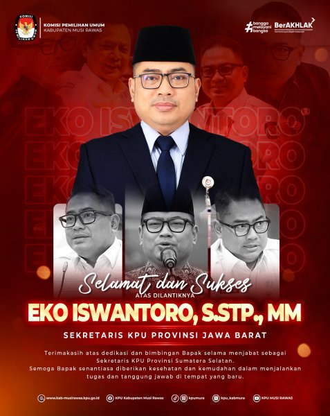 #TemanPemilih, segenap jajaran KPU Kabupaten Musi Rawas mengucapkan Selamat dan Sukses atas dilantiknya Bapak Eko Iswantoro, S.STP., MM sebagai Sekretaris KPU Provinsi Jawa Barat ..