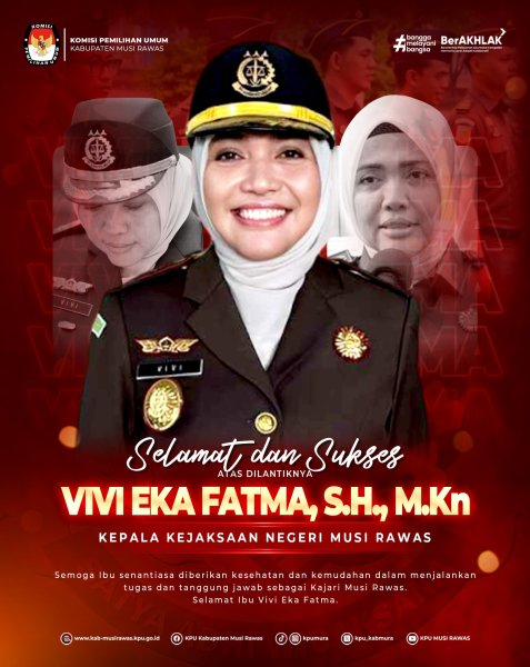 #TemanPemilih, segenap jajaran KPU Kabupaten Musi Rawas mengucapkan Selamat dan Sukses atas dilantiknya Ibu Vivi Eka Fatma, S.H., M.Kn sebagai Kepala Kejaksaaan Negeri Kabupaten Musi Rawas ..