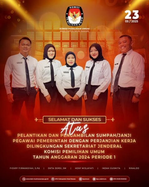 #TemanPemilih, segenap jajaran KPU Kabupaten Musi Rawas mengucapkan Selamat atas Pelantikan dan Pengambilan Sumpah/Janji Pegawai Pemerintah dengan Perjanjian Kerja (PPPK) Sekretariat Jenderal Komisi Pemilihan Umum Tahun Anggaran 2024 Periode 1 (23/5/2025) ..