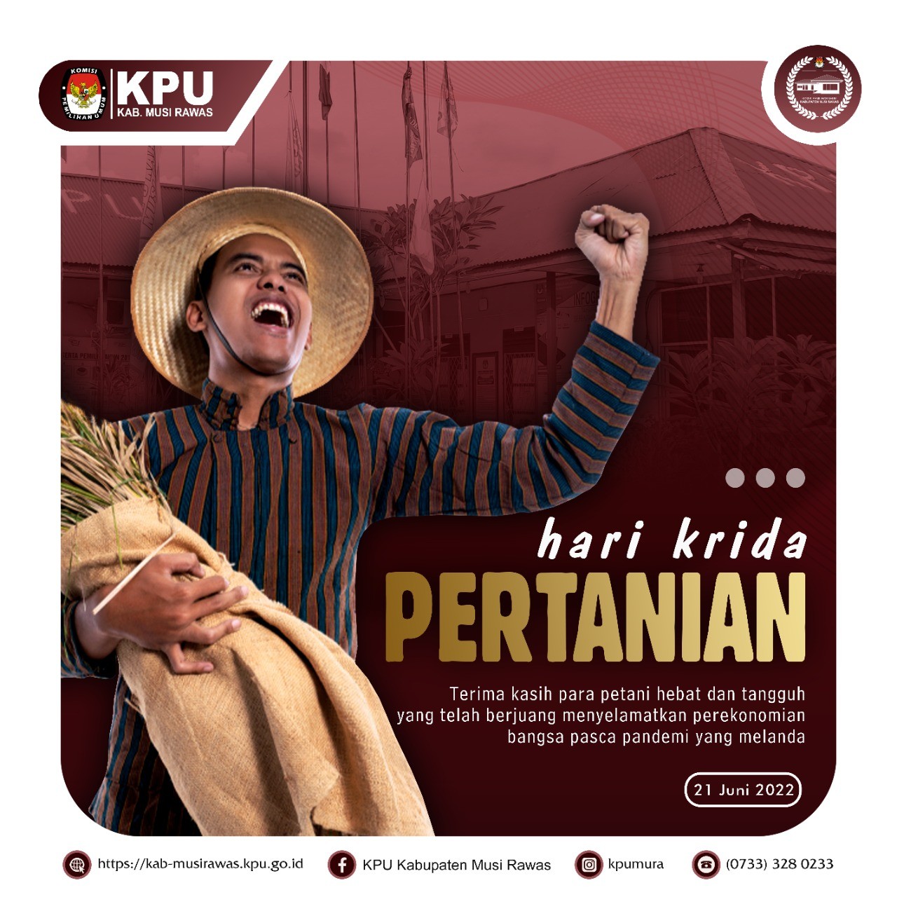 KPU Kab. Musi Rawas mengucapkan "Selamat Hari Krida Pertanian". Teman pemilih perlu tau nih bahwa kata "Petani" memiliki akronim yaitu Penyanggah Tatatan Negara Indonesia...Tambah pengetahuan lagi nih...