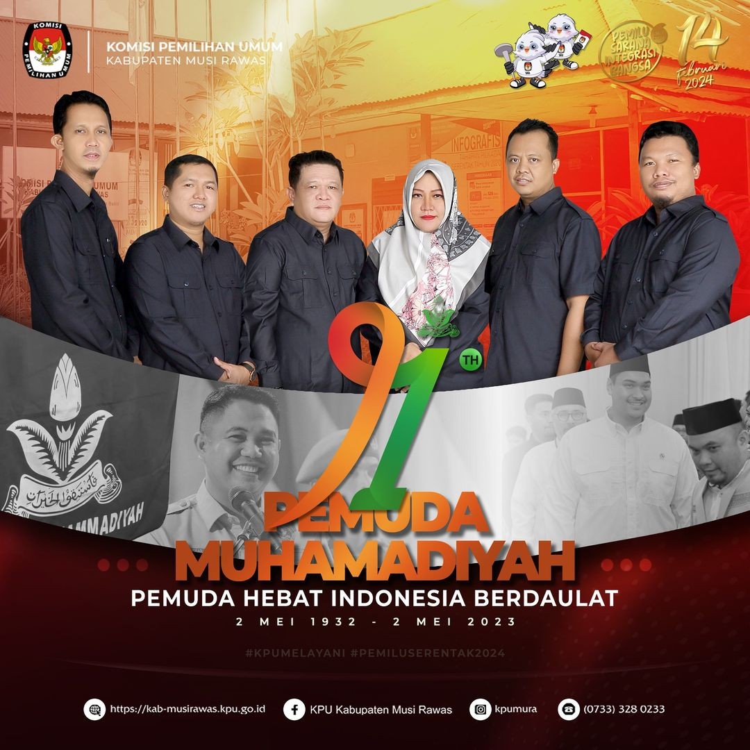 #TemanPemilih, segenap jajaran KPU Kabupaten Musi Rawas mengucapkan Selamat Hari Lahir Pemuda Muhammadiyah Ke-91 (2 Mei 1932 - 2 Mei 2023) ..