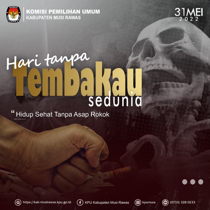 KPU Kabupaten Musi Rawas mengucapkan Selamat Hari Tanpa Tembakau Sedunia,..Hidup sehat tanpa asap rokok, karena asap rokok bukan hanya membahayakan perokok saja melainkan juga orang lain..