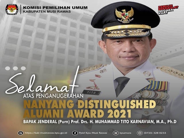 Selamat kepada Bapak Jenderal (Purn) Prof. Drs. H. Muhammad Tito Karnavian, M.A.,Ph.D. atas penganugerahan "Nanyang Distinguished Alumni Award 2021"
