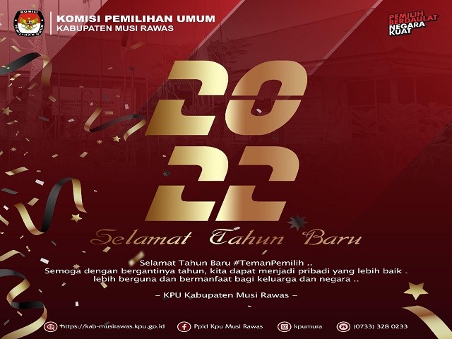Segenap keluarga besar KPU Kabupaten Musi Rawas mengucapkan Selamat Tahun baru 2022. Semoga segala urusan dapat diperlancar di tahun depan.