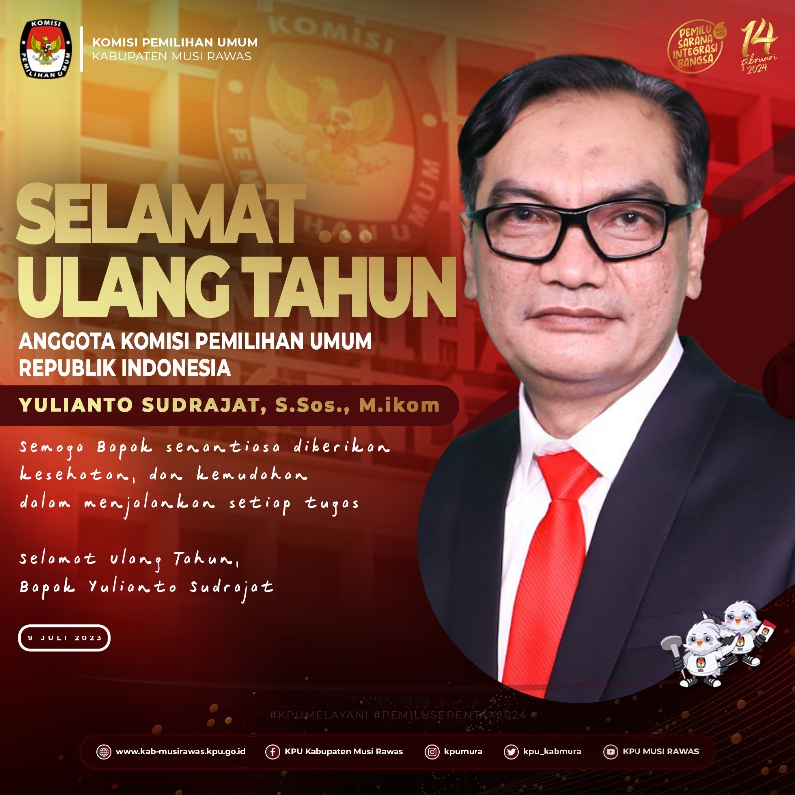 #TemanPemilih, segenap jajaran KPU Kabupaten Musi Rawas mengucapkan Selamat Ulang Tahun kepada Bapak Yulianto Sudrajat, S.Sos., M.Ikom (Anggota KPU Republik Indonesia) .. .