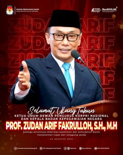 #TemanPemilih, segenap jajaran KPU Musi Rawas mengucapkan Selamat Ulang Tahun kepada Ketua Umum Dewan Pengurus KORPRI Nasional dan Kepala Badan Kepegawaian Negara, Bapak Prof. Zudan Arif Fakrulloh, S.H., M.H..