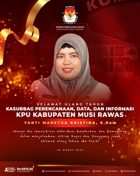 #TemanPemilih, segenap jajaran KPU Kabupaten Musi Rawas mengucapkan selamat ulang tahun kepada Ibu Yanti Maretha Kristina, S.Kom (Kasubbag Perencanaan, Data, dan Informasi KPU Kabupaten Musi Rawas) ..