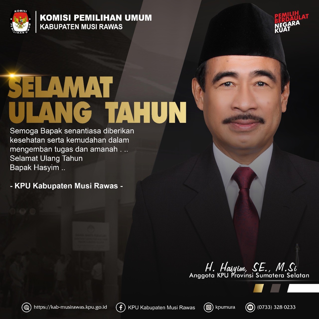 Segenap keluarga besar KPU Kabupaten Musi Rawas mengucapkan selamat ulang tahun kepada Bapak H. Hasyim, S.E.,M.Si. (Anggota KPU Provinsi Sumatera Selatan), semoga Bapak selalu diberikan kesehatan dan kemudahan dalam menjalankan tugas dan amanah.