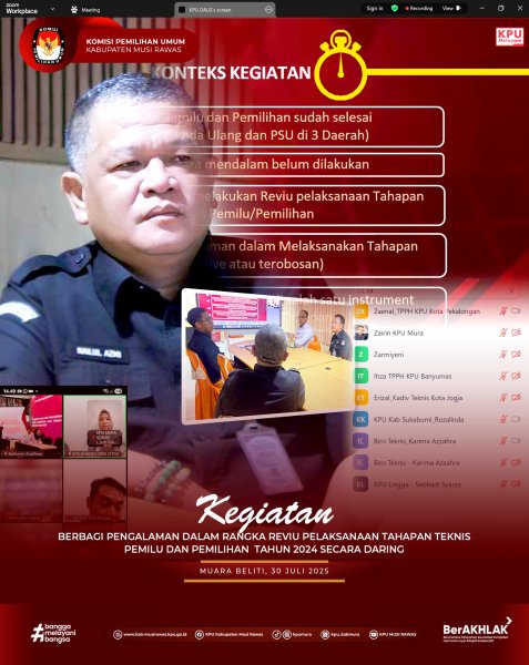 #TemanPemilih, KPU Kabupaten Musi Rawas mengikuti Kegiatan Berbagi Pengalaman dalam rangka Reviu Pelaksanaan Tahapan Teknis Pemilu dan Pemilihan Tahun 2024 secara daring di Kantor KPU Kabupaten Musi Rawas (30/7/2025) ..
