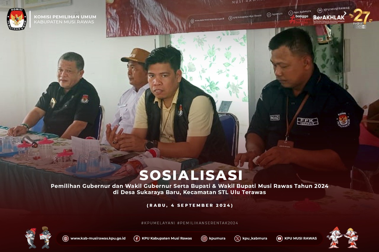 #TemanPemilih, KPU Kabupaten Musi Rawas Melaksanakan Sosialisasi Pemilihan Gubernur dan Wakil Gubernur Serta Bupati & Wakil Bupati Musi Rawas Tahun 2024 di Desa Sukaraya Baru, Kecamatan STL Ulu Terawas (4/9/2024) .. .