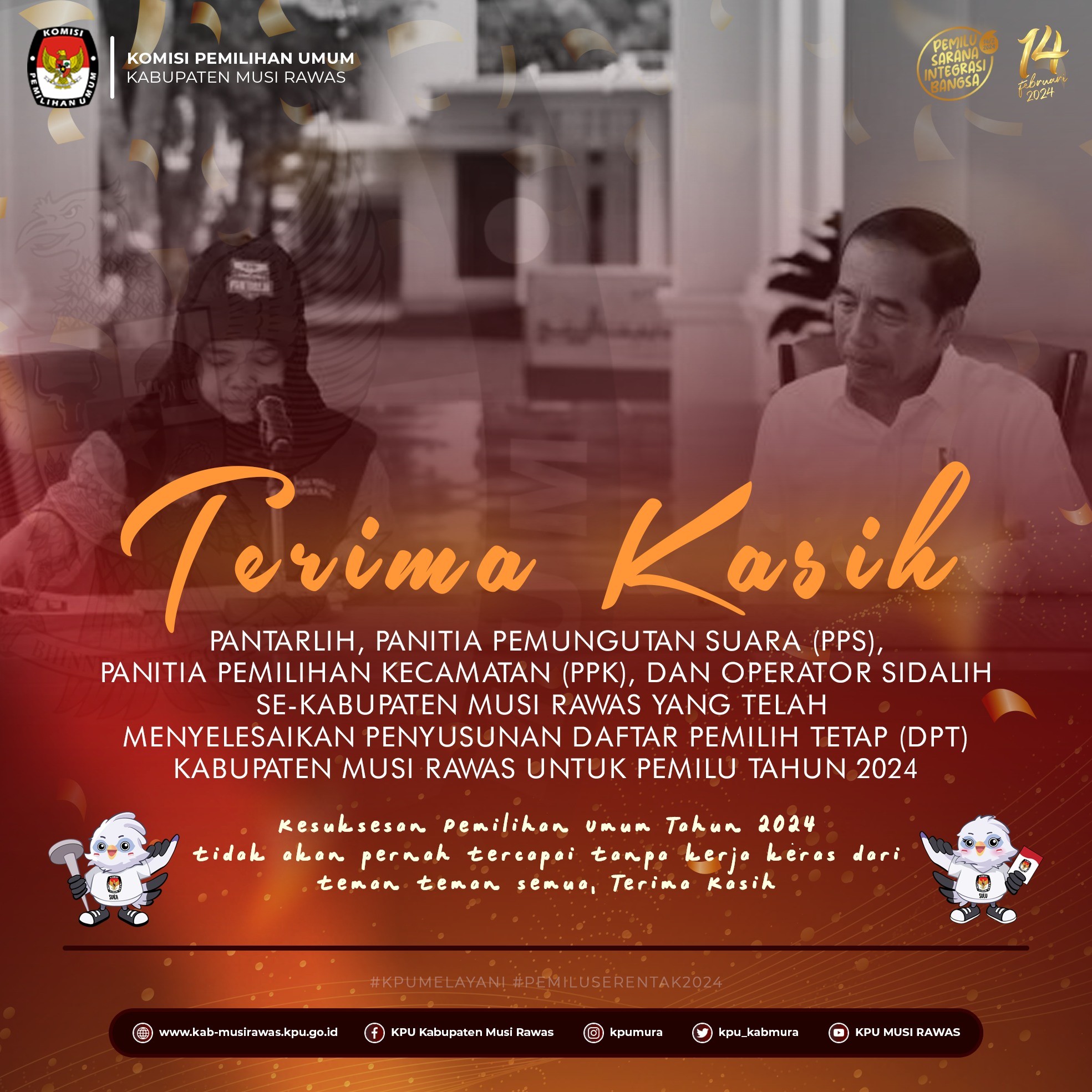 #TemanPemilih, KPU Kabupaten Musi Rawas mengucapkan Terima Kasih kepada Petugas Pemutakhiran Data Pemilih (Pantarlih), Panitia Pemungutan Suara (PPS), Panitia Pemilihan Kecamatan (PPK), dan Operator Sistem Informasi Data Pemilih (SIDALIH) Se-Kabupaten Musi Rawas atas partisipasi dan kerja kerasnya dalam penyelesaian penyusunan Daftar Pemilih Tetap (DPT) Kabupaten Musi Rawas pada Pemilihan Umum Tahun 2024 . ..