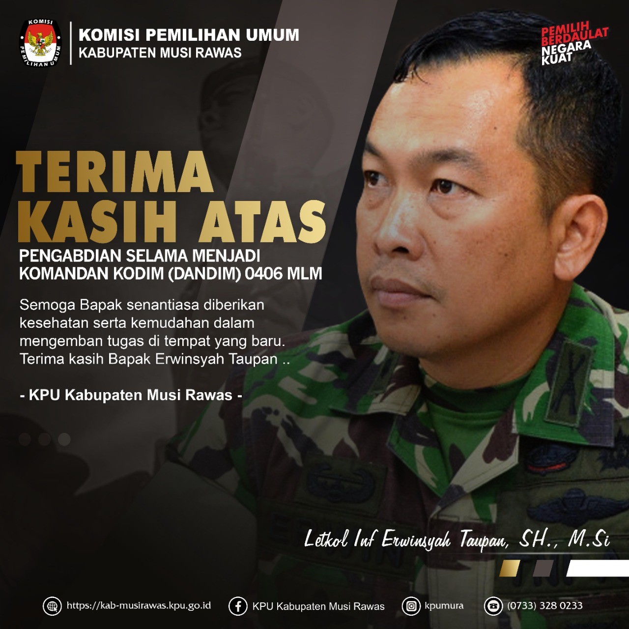 Terima kasih atas pengabdian Bapak Letkol Inf Erwinsyah Taupan, S.H.,M.Si. selama menjabat sebagai Komandan Kodim 0406 MLM. Semoga Bapak selalu diberikan kesehatan dan kekuatan untuk mengabdi di tempat yang baru..