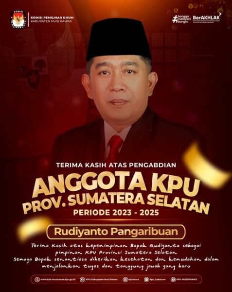 Terima Kasih atas Pengabdiannya Anggota KPU Provinsi Sumatera Selatan Periode 2023-2025 Bapak Rudiyanto Pangaribuan