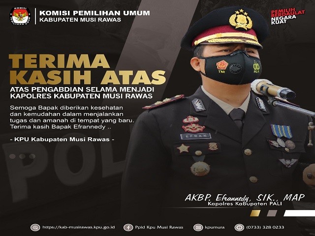 Terima Kasih Bapak AKBP. Efrannedy, S.I.K.,M.A.P. (Mantan Kapolres Kabupaten Musi Rawas) atas dedikasi dan pengabdian yang diberikan selama menjabat sebagai Kapolres Kabupaten Musi Rawas. Selamat bertugas di tempat yang baru dan semoga selalu diberikan kesehatan dan kemudahan dalam menjalankan amanah.