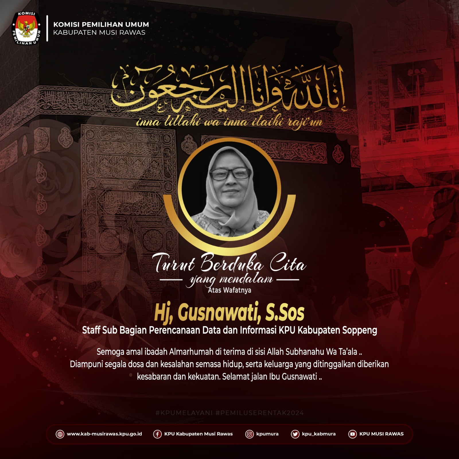 #TemanPemilih, segenap keluarga besar KPU Kabupaten Musi Rawas mengucapkan duka cita mendalam atas meninggalnya Ibu Hj. Gusnawati, S.Sos (Staff Sub Bagian Perencanaan, Data, dan Informasi KPU Kabupaten Soppeng).. .