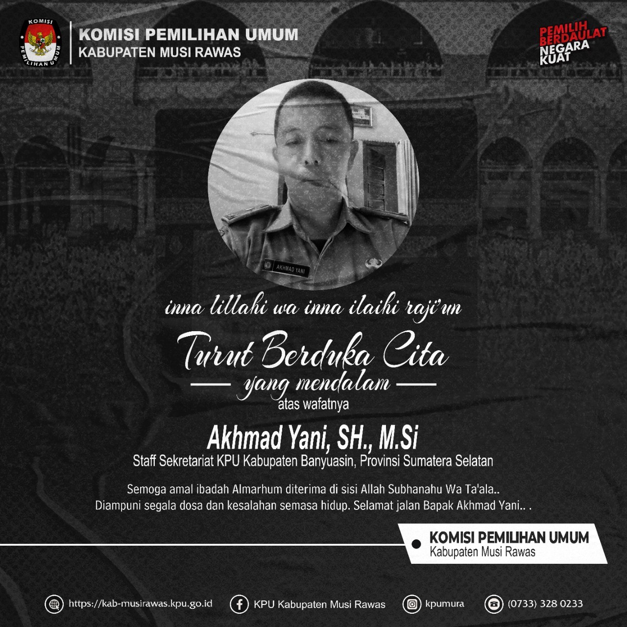 Turut berdukacita atas wafatnya Bapak Akhmad Yani,S.H.,M.Si.(Staff Sekretariat KPU Kabupaten Banyuasin, Provinsi Sumatera Selatan)