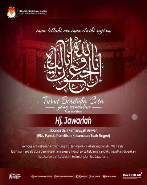 #TemanPemilih, segenap jajaran KPU Kabupaten Musi Rawas turut berduka cita atas berpulangnya Ibu Hj. Jawariah (Ibunda dari Firmansyah Anwar - Eks. Panitia Pemilihan Kecamatan Tuah Negeri) ..