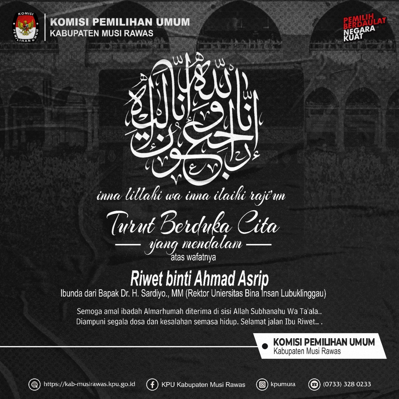 Segenap keluarga besar KPU Kabupaten Musi Rawas mengucapkan turut berdukacita atas wafatnya Ibu Riwet binti Ahmad Asrip (Ibunda dari Bapak Dr. H. Sardiyo, M.M.,Rektor Universitas Bina Insan Lubuklinggau). Semoga almarhum khusnul khotimah dan keluarga yang ditinggalkan diberikan kekuatan dan kesabaran...