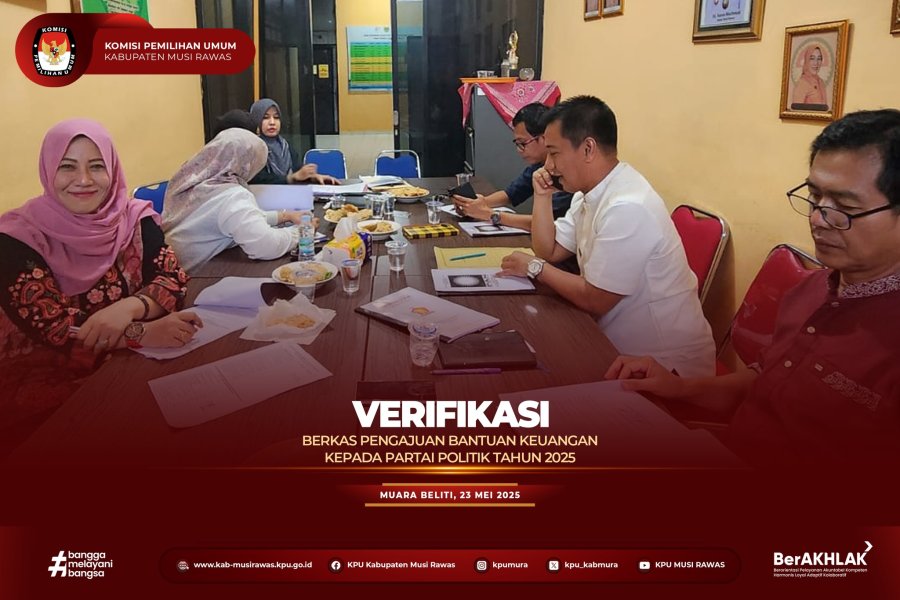 #TemanPemilih, Ketua KPU Kabupaten Musi Rawas, Ibu Ania Trisna AD, SH., MH didampingi oleh Kasubbag Teknis dan Hukum, Ibu Erlina, S.Kom., MM menghadiri kegiatan verifikasi berkas pengajuan bantuan keuangan untuk Partai Politik Tahun 2025 (23/5/2025) ..