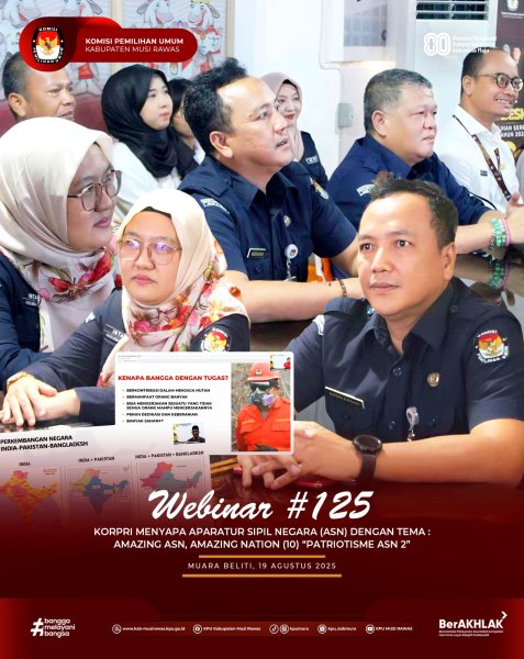 #TemanPemilih, Sekretariat KPU Kabupaten Musi Rawas mengikuti Webinar #125, KORPRI menyapa ASN dengan tema Amazing ASN, Amazing Nation (10) : "Patriotisme ASN 2" secara daring di Kantor KPU Kabupaten Musi Rawas (19/8/2025) ..
