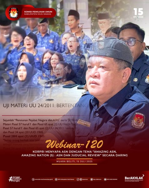 #TemanPemilih, KPU Kabupaten Musi Rawas mengikuti Seri Webinar-120 KORPRI Menyapa ASN dengan tema "Amazing ASN, Amazing Nation (5) : ASN dan Judicial Review” secara daring di Kantor KPU Kabupaten Musi Rawas (15/7/2025) ..
