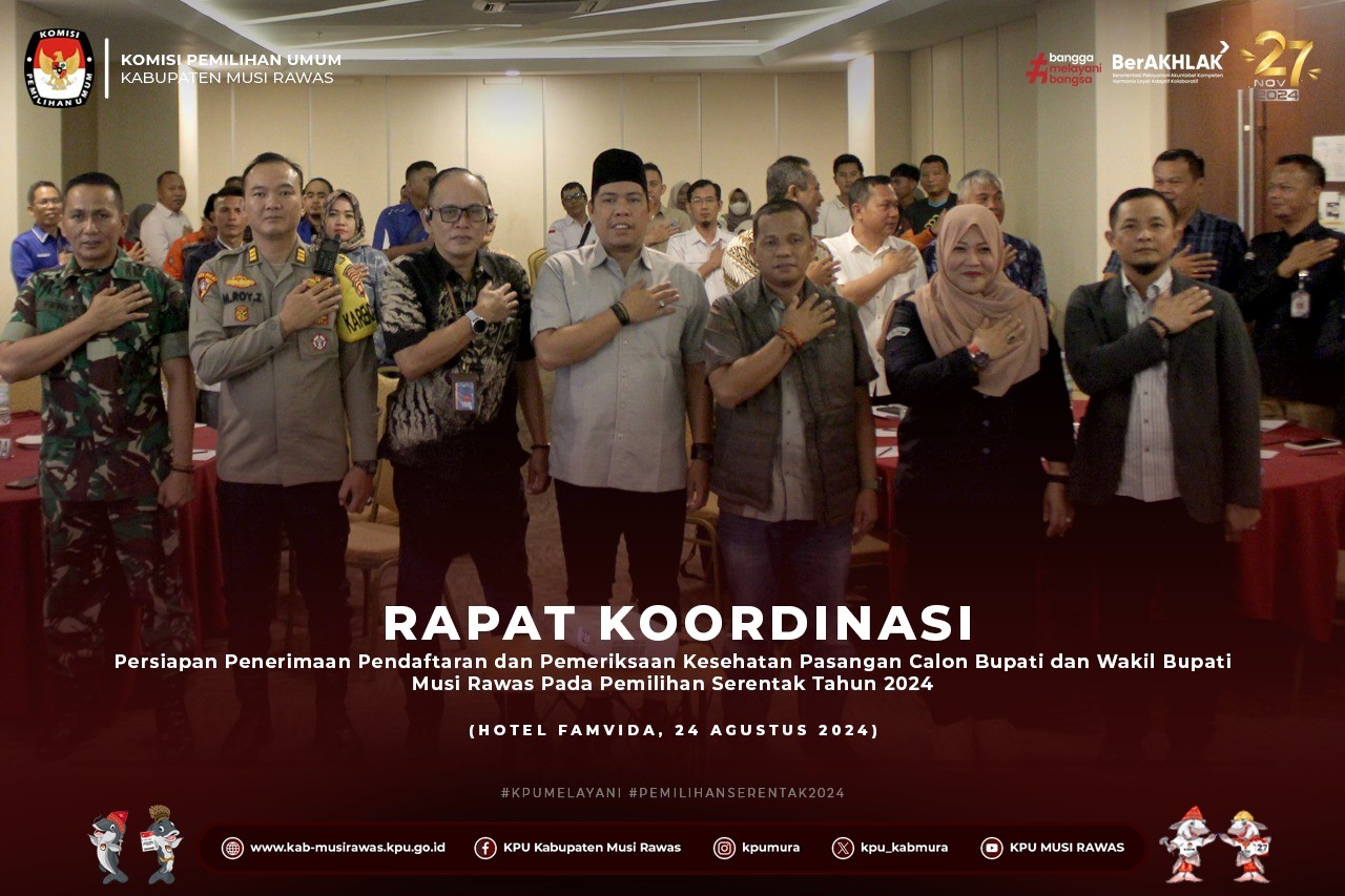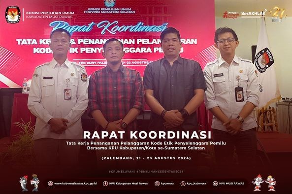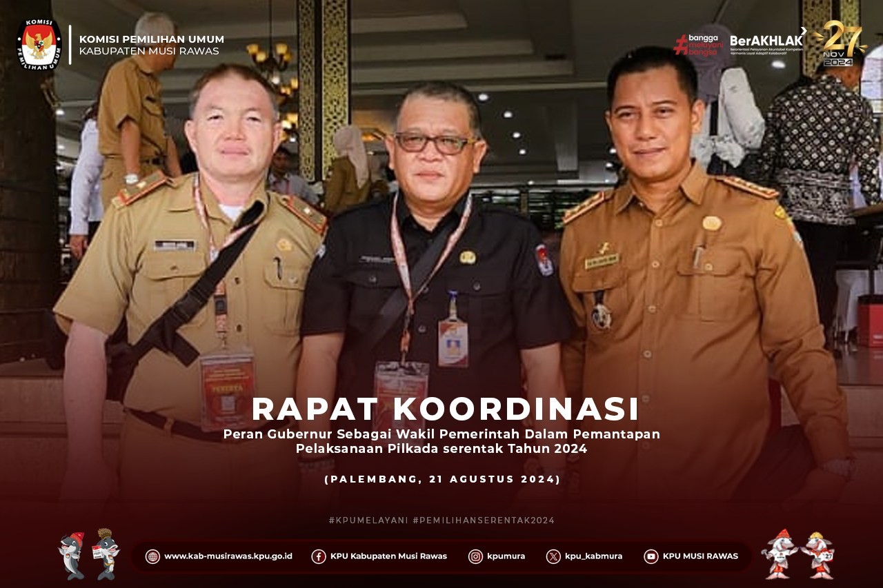 #TemanPemilih, KPU Kabupaten Musi Rawas Mengikuti Rapat Koordinasi Peran Gubernur sebagai Wakil Pemerintah Dalam Pemantapan Pelaksanaan Pilkada serentak tahu 2024 di Griya Agung, Rabu (21/8/2024).