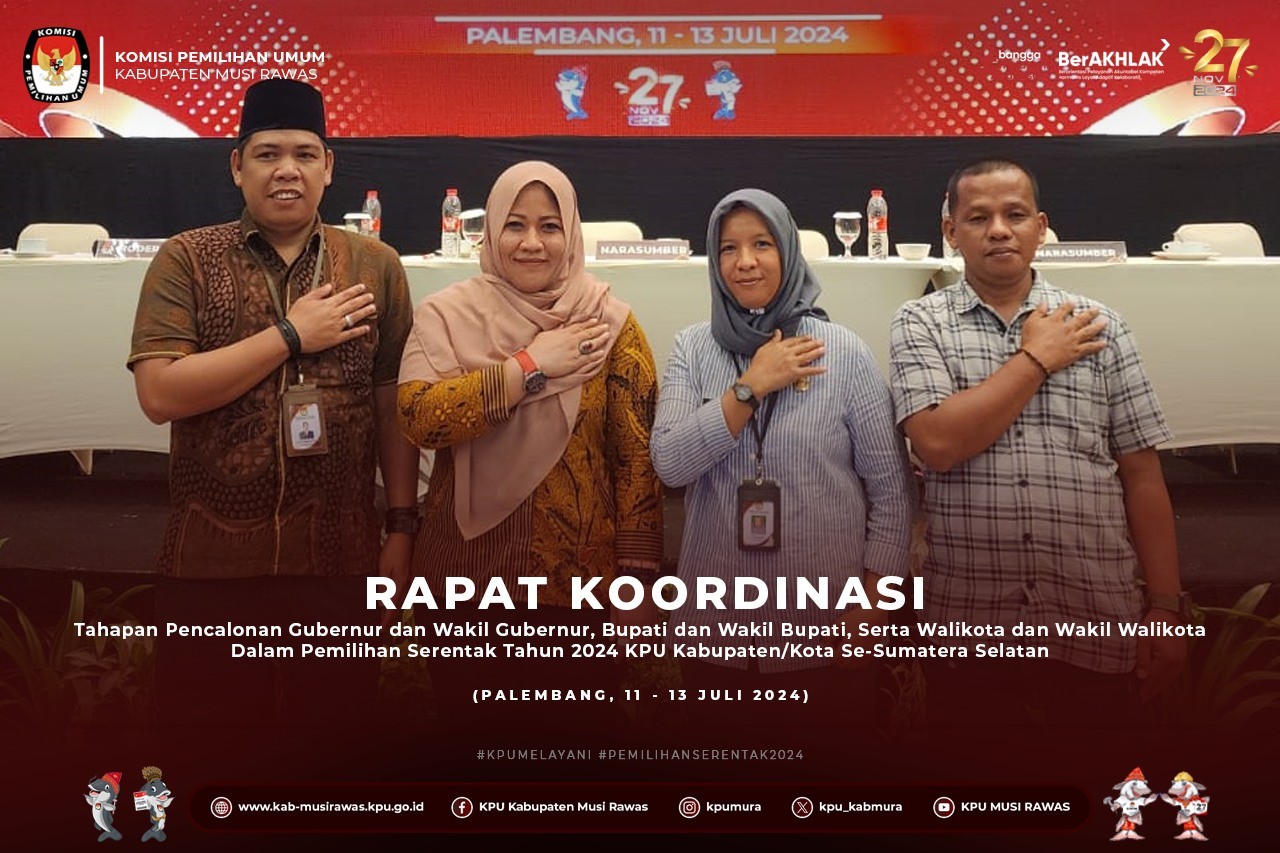 #TemanPemilih, KPU Kabupaten Musi Rawas Mengikuti Rapat Koordinasi Tahapan Pencalonan Gubernur dan Wakil Gubernur, Bupati dan Wakil Bupati, Serta Walikota dan Wakil WalikotaDalam Pemilihan Serentak Tahun 2024 KPU Kabupaten/Kota Se-Sumatera Selatan yang berlangsung di Kota Palembang (11-13/7/2024) ..