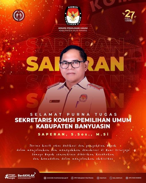 #TemanPemilih, segenap jajaran KPU Kabupaten Musi Rawas mengucapkan Selamat memasuki Masa Purna Tugas kepada Bapak Saperan, S.Sos., M.Si (Sekretaris KPU Kabupaten Banyuasin) . ..