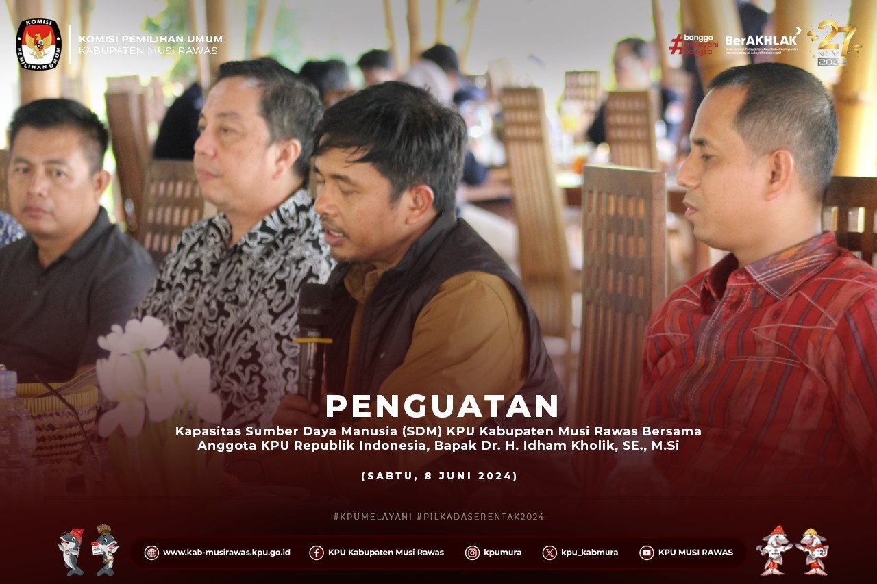 #TemanPemilih, KPU Kabupaten Musi Rawas melaksanakan Kegiatan Kapasitas Sumber Daya Manusia (SDM) KPU Kabupaten Musi Rawas Bersama Anggota KPU Republik Indonesia, Bapak Dr. H. Idham Kholik, SE., M.Si yang berlangsung di Mang Engking (8/6/2024) ..