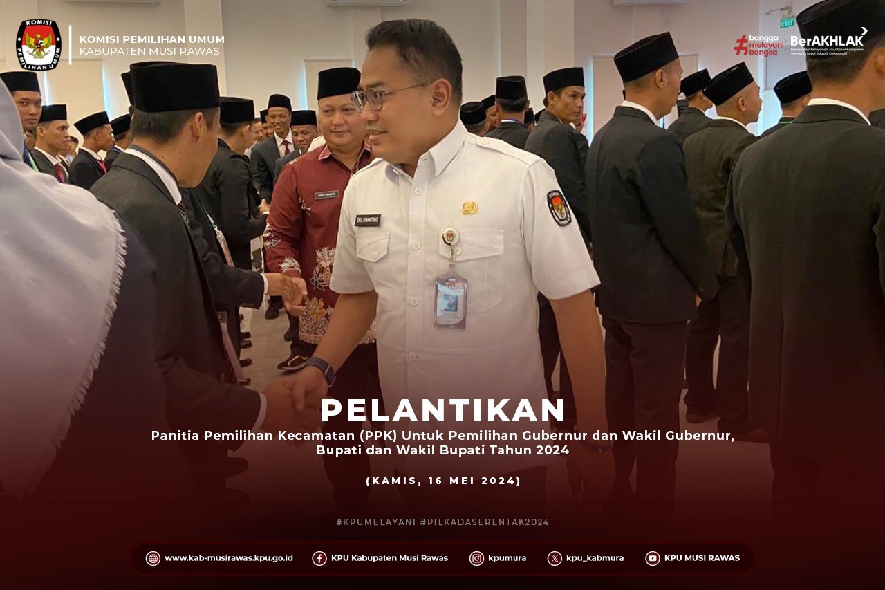 #TemanPemilih, KPU Kabupaten Musi Rawas Melaksanakan Kegiatan Pelantikan Panitia Pemilihan Kecamatan (PPK) Untuk Pemilihan Gubernur dan Wakil Gubernur, Bupati dan Wakil Bupati Pada Kabupaten Musi Rawas Tahun 2024 yang berlangsung di Hotel Dewinda (16/5/2024)..