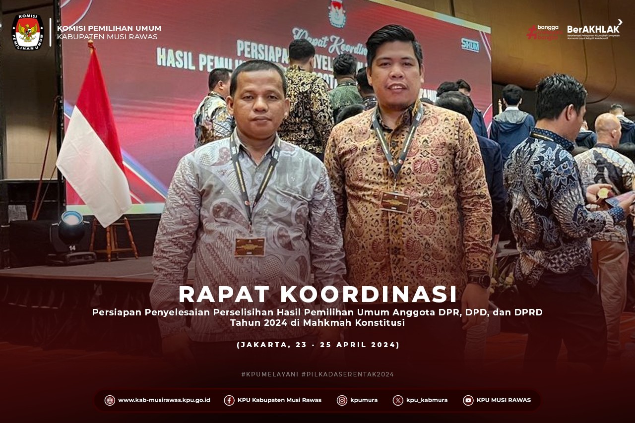 #TemanPemilih, KPU Kabupaten Musi Rawas menghadiri Rapat Koordinasi Persiapan Penyelesaian Hasil Pemilihan Umum Anggota DPR, DPD dan DPRD Tahun 2024 di Mahkamah Konstitusi, di Jakarta (23 - 25/4/2024) ..